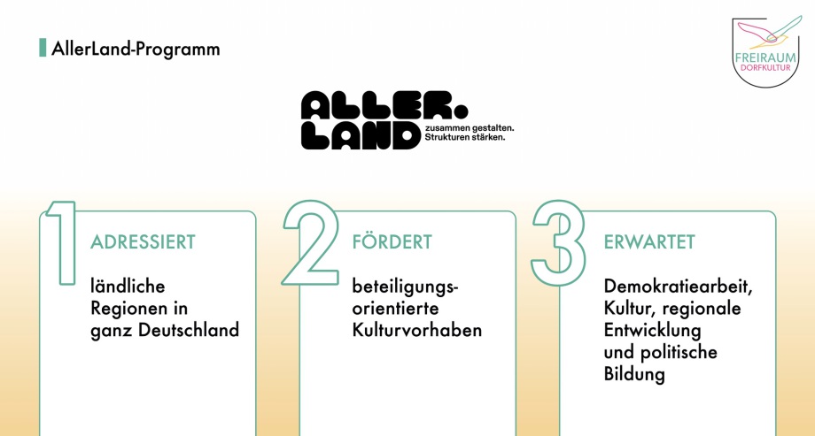 Wir bereiten dazu entsprechende Video-Clips zum besseren Verständnis vor für die einzelnen Kulturvorhaben und Interventionen. Sie werden in der digitalen Modellierung unseres ländlichen Raums abrufbar sein. Hier findet sich der Kern unserer Beteiligung an Aller.Land. Es handelt sich nicht um ein reines Kulturprogramm. Gefordert ist ausdrücklich Demokratiearbeit, regionale Entwicklung und politische Bildung. Darin liegt einer unserer Schwerpunkte. Die Förderung der beteiligungsorientierten Kulturvorhaben (weiterer Schwerpunkt) ist in jedem einzelnen Vorhaben ebenfalls vorhanden.
