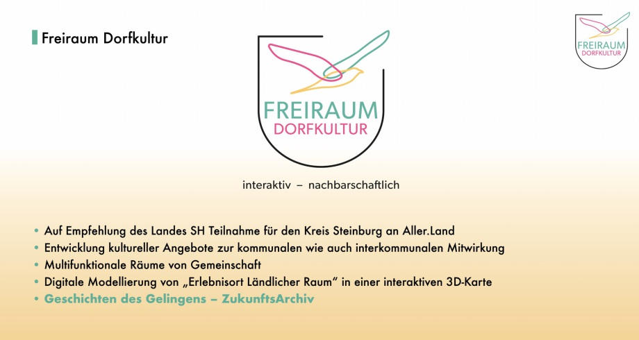Aller.Land am Beispiel von 3 Referenzgemeinden in der Entwicklungsphase 2024/25 und in allen 20 Gemeinden aus Itzehoe-Land in der Umsetzungsphase 2025-2030. Multifunktionale Räume für Gemeinschaften, kommunal und interkommunal, für gemeinschaftliche Aktionen, für beteiligungsorientierte künstlerische Interventionen in unserem ländlichen Raum. Eine Sammlung von Geschichten des Gelingens für ein Zukunftsarchiv der Gemeinden im Amt Itzehoe-Land. Wir beteiligen uns an der Entwicklungsphase des Programms Aller.Land.