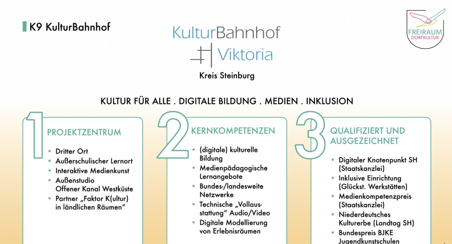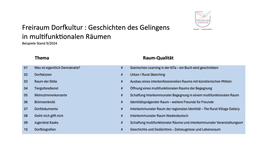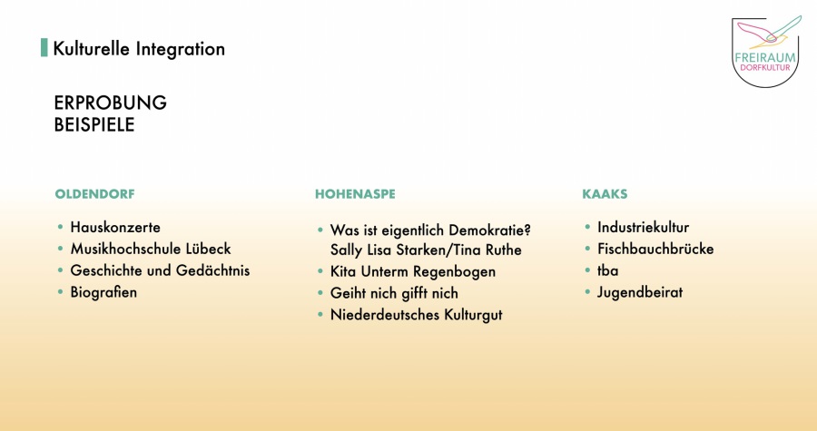 Zur Zeit befinden sich in unseren Referenzgemeinden die Erprobung herausragender Anwendungen in multifunktionalen Räumen. In dieser Phase bauen wir auf eine Zusammenarbeit mit der Musikhochschule Lübeck, fragen nach spielerischen Ansätzen von Demokratie in den KiTas unserer Referenzgemeinden, lassen das industrielle wie auch immaterielle Kulturerbe sprechen und öffnen uns ganz und gar den Bedarfen und Ideen der Jugend im ländlichen Raum.