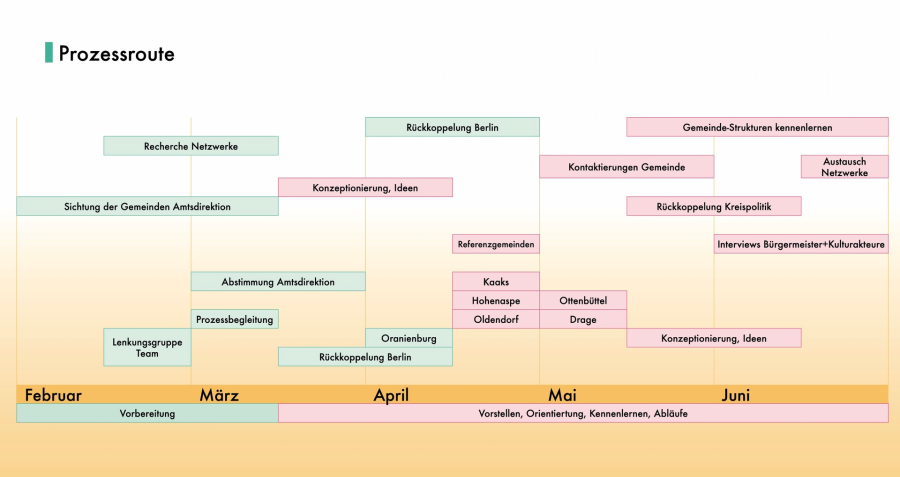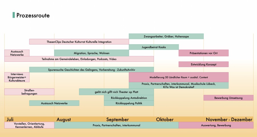 Die dritte Phase (August bis Oktober, GRÜN) spiegelt die Spuren von Geschichten des Gelingens, Partnerschaften und interkommunale Navigation. Zusätzlich wurde und wird die Rückkoppelung zur Amtsdirektion und zur Politik hergestellt.